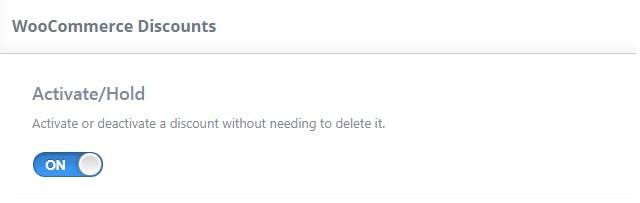 1. WooCommerce Product Discounts module can be enabled or disabled by pressing the “Activate/Hold” switcher button from the module panel.
