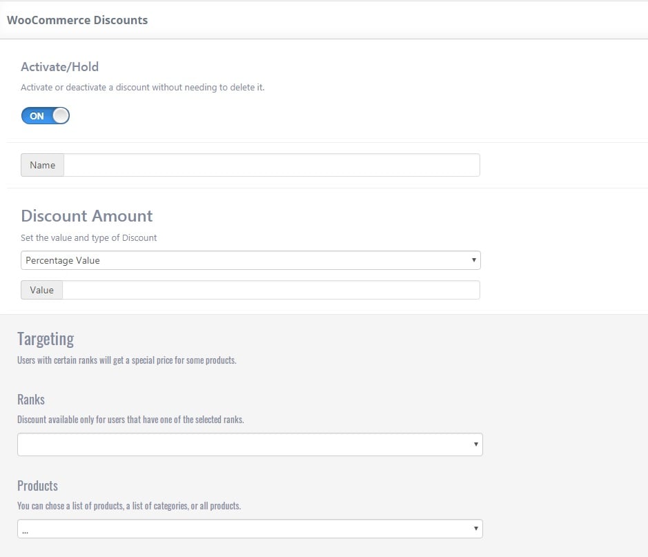 In Targeting area, a discount can be applied based on “Ranks” and “Products”.
