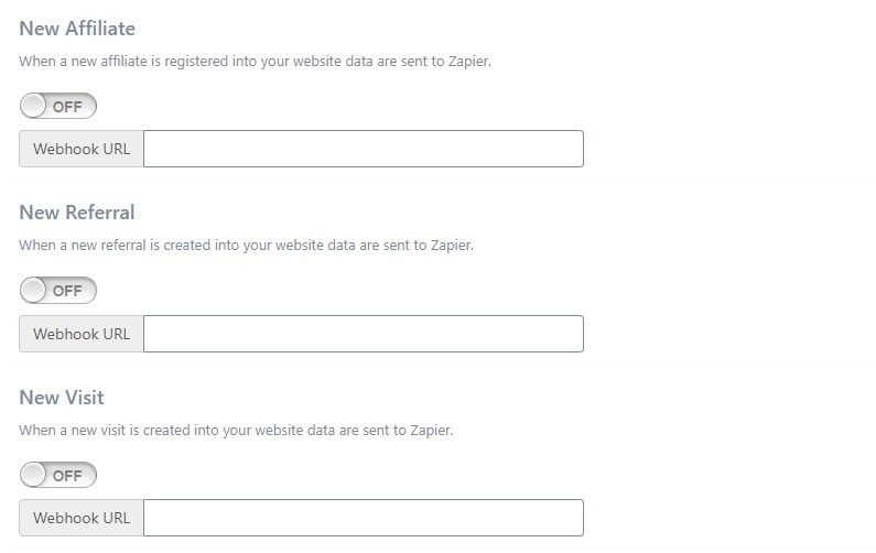 For every trigger like ‘New Affiliate’, ‘New Referral’, ‘New Visit’ you may set the webhook URL in Zapier and put it in ‘Webhook URL’ in order to be used by another app.